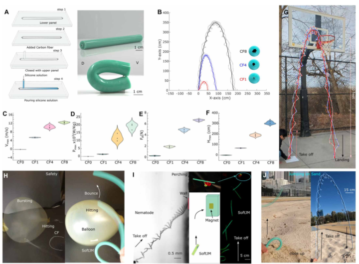 他们还验证了几个实用性功能:图7G跳过一个3.05米高的篮球框(约25倍体长),图7H显示碳纤维骨架可以戳破气球,但被硅胶包裹后撞击气球只会弹开,不会伤人。图7J展示了沙地跳跃能力——对软体机器人来说,在松软介质上起跳比硬地面更难,但SoftJM 4依靠足够的功率输出做到了。
