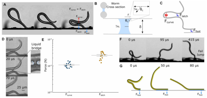 还有一个细节:如果尾部的液体桥黏附力过大,线虫即使打开了腹侧水膜,也可能跳不起来(图4F-G)。这解释了为什么环境湿度太高时,线虫跳不成功——不是扭结没形成,而是尾部被“粘”住了。