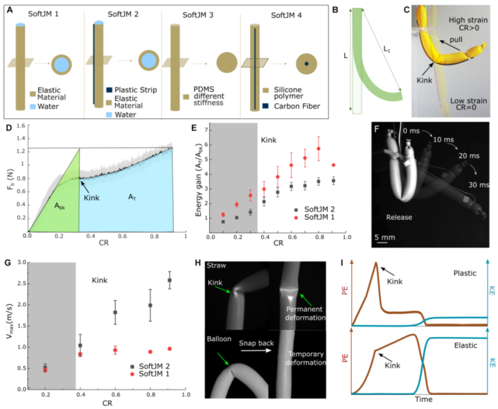 图5E显示,SoftJM 1(水球)和SoftJM 2(水球+塑料条)相比无扭结的理想线性弹簧,实际储存的能量分别提升了5倍和4倍。更重要的是,图5G显示扭结后弹开的最大速度随压缩比增加而提升,说明扭结不是“耗能”的失效,而是让能量释放更快。