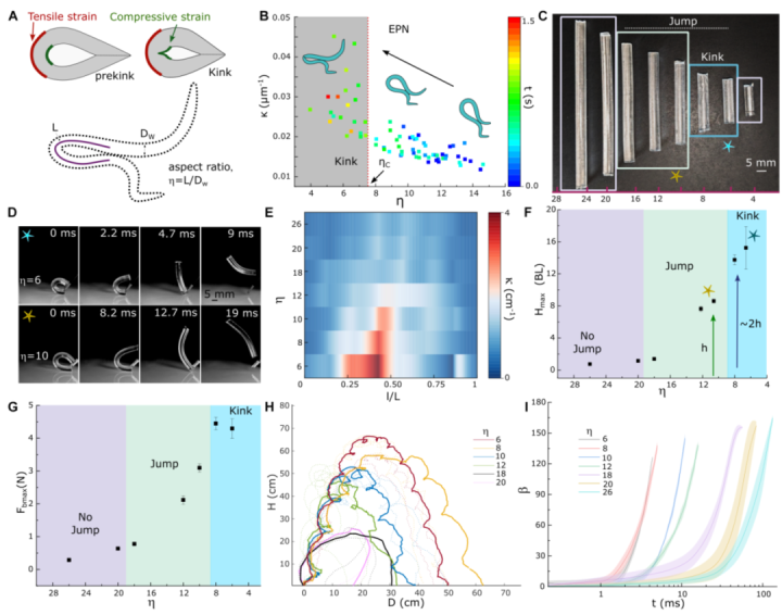 图6F和I进一步证实:长径比从12降到6(跨过临界值约7),跳跃高度从约5倍体长提升到约16倍体长,弹开速度也显著加快。换句话说,线虫主动压缩身体长径比,目的就是“越过”扭结的触发阈值,进入一种新的储能模式。