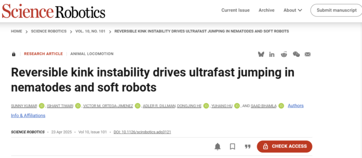 引文格式:Kumar S, Tiwari I, Ortega-Jimenez V M, et al. Reversible kink instability drives ultrafast jumping in nematodes and soft robots[J]. Science Robotics, 2025, 10: eadq3121.