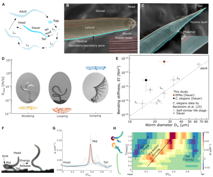 图3 线虫的弯曲刚度和曲率分析。(A)线虫的生命阶段,从幼虫阶段L1到L4和成虫阶段,而另一个非摄食幼虫阶段(道伊尔)生命周期是从L1到道伊尔再到成虫阶段。(B)一只EPN的扫描电子显微镜(SEM ),突出显示了一只受感染幼体(dauer)的头部和颈部。黑色箭头表示头部的嘴和分泌孔。插图显示了EPN车身的侧面。(C)EPN尾部的扫描电镜,插图显示线虫的腹侧。(D)小提琴图显示了在瞬动(n = 6)、成圈(n = 14)和跳跃(n = 6)期间,成圈和瞬动之间(P