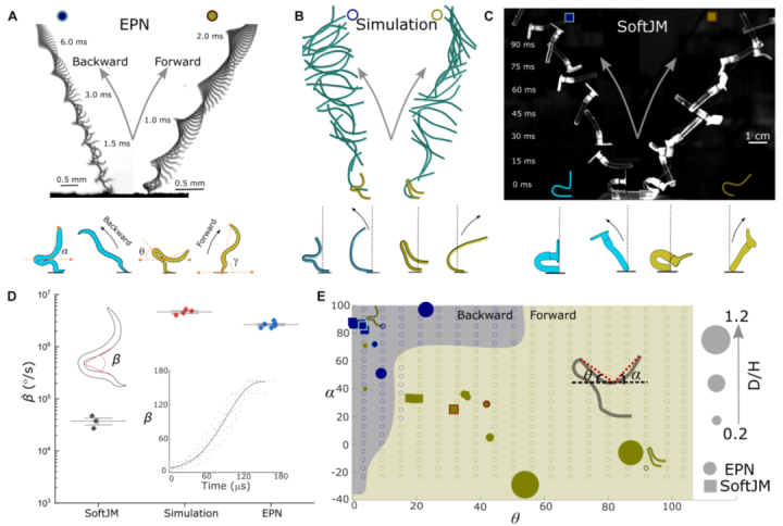 图2 EPN的定向跳跃,SoftJM和模拟。(A)EPN向后和向前跳跃。EPN的起飞角度(γ)取决于其姿态,由角度θ和α量化。调整这些角度可以相对于其与基板的接触点向后或向前移动其COM,从而导致向后跳跃(α=∞90°,θ=∞0°,γ=∞120°)或向前跳跃(α=∞45°,θ=∞45°,γ=∞60°),更多详情请参见图S3A和表S5。(B和C) Cosserat杆模拟和软跳高运动员的物理模型说明了向前和向后方向的跳跃。(d)soft JM(n = 3个人)、模拟(n = 4次实现)和EPNs (n = 7个人)的角速度(̇ β)。插图显示了作为EPN(n = 5)的时间函数绘制的张角β。(E)模拟EPN不同姿态的模拟结果,用不同颜色表示向后(蓝环)和向前(黄环)起飞。圆圈代表EPN跳跃,而正方形代表SoftJM跳跃。这些纯色数据点的大小与其归一化轨迹范围(D/H)成比例。