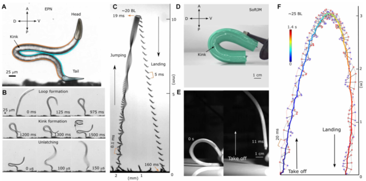 图1展示了线虫跳跃的全过程。A图是线虫静息状态(体长0.5毫米,直径20微米,长径比25:1)。B图是关键的“扭结”状态:线虫把身体弯成α形环,在腹侧形成高曲率扭结。C图是弹开后腾空,高度超过20倍体长。